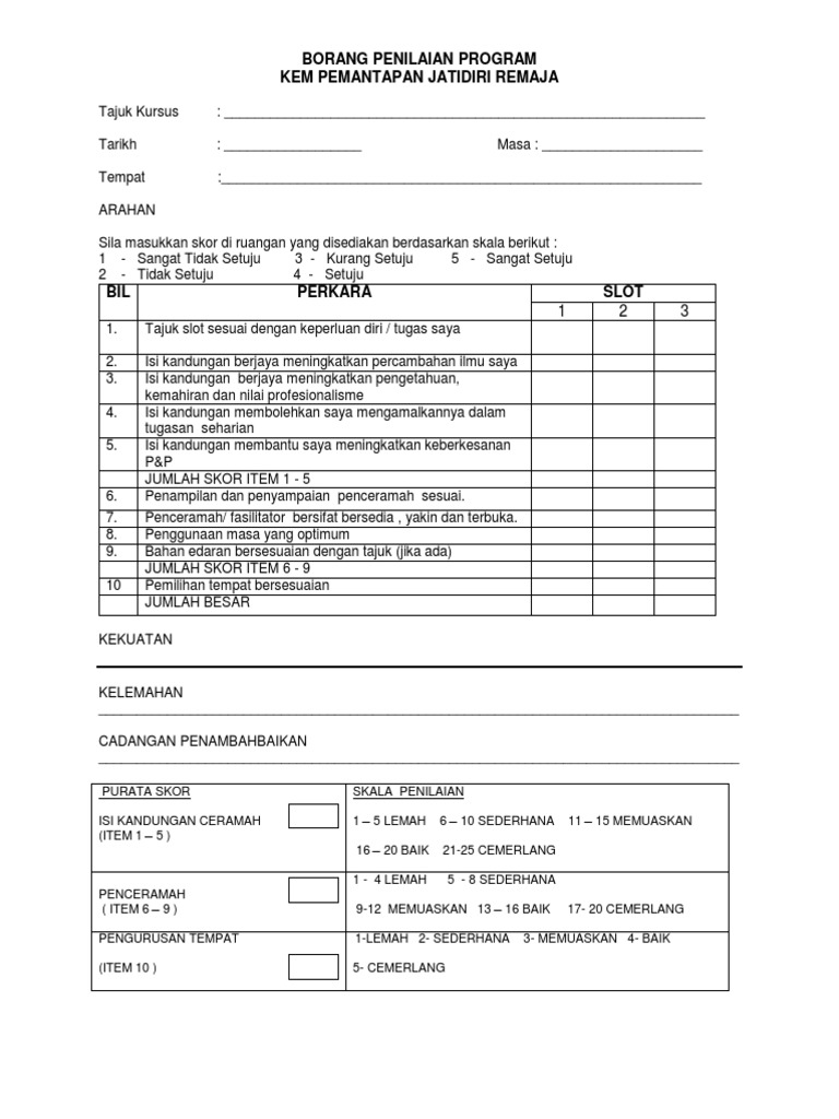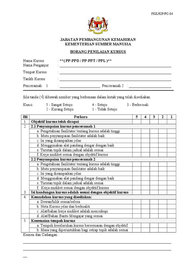 Pejabat Daerah & Tanah Temerloh › Penilaian Kaji Selidik from pdttemerloh.pahang.gov.my Bil item 1 2 3 4 5 penilaian penceramah 1. Pada keseluruhannya latihan/kursus ini adalah berjaya dan bermanfaat. Bagaimana anda penilai keberkesanan kandungan kursus ? Contoh pengisian borang penilaian prestasi guru. Institut latihan pentadbiran dan pengurusan pengangkutan laut. Peningkatan pengetahuan pemahaman berbanding sebelum ini. Institut latihan dewan bandaraya kuala lumpur (idb) jabatan pengurusan sumber manusia dewan bandaraya kuala lumpur. Tindakan ini akan melihat keberkesanan latihan litar yang telah diubahsuaikan dalam mempertingkatkan tahap ketangkasan bola jaring di kalangan murid perempuan tahap 2.
